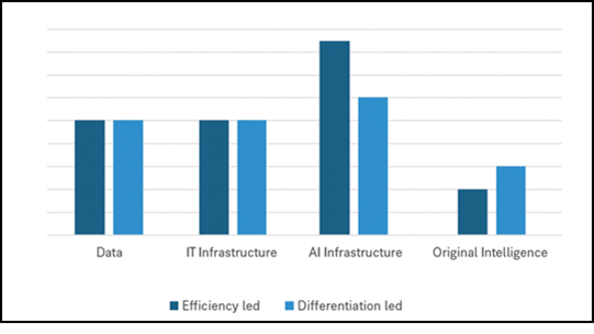 In AI enabled enterprise, the technology value stack includes four components: data, infrastructure, AI systems, and Original Intelligence. As AI dominates the first three layers, OI is the defining source of differentiation. Where efficiency becomes ubiquitous—the spoken promise of AI—few organizations will succeed by competing on efficiency alone. Differentiation through OI is becoming more and more important.