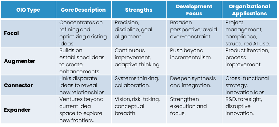 Using OIQ scores, we can get to a level of specificity to allow for more effective team building, training and job matching in a post AI environment. This occurs by identifying how an individual demonstrates OI through a distinct cognitive pattern—an OIQ Type. Hupside identifies 10 distinctive human patterns for applying OI in their role performance. The four primary OIQ Types are provided below (Figure 2).