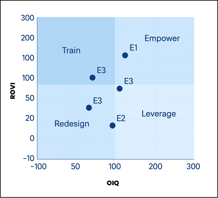 • High OIQ / Low ROVI: Leadership or workflow redesign.