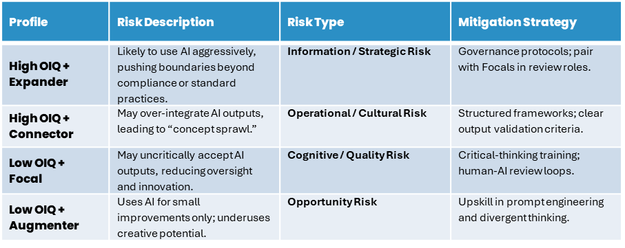 • High OIQ (Expanders and Connectors) with high ROVI: individuals more likely to be natural early adopters, but also potentially requiring oversight and AI governance constraints.