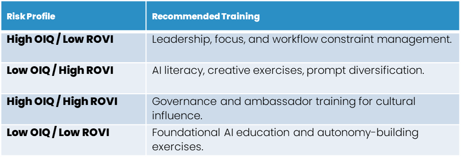 • High OIQ (Expanders and Connectors) with low ROVI: individuals likely to be frustrated by AI adoption mandates without opportunity to innovate.