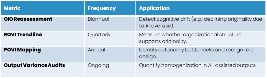 Because there are proven cognitive risks to overreliance on AI, and also because the capabilities of AI continue to increase, continued measurement of OIQ and ROVI will allow an organization to keep pace. Some recommended metrics include ongoing measurement of: