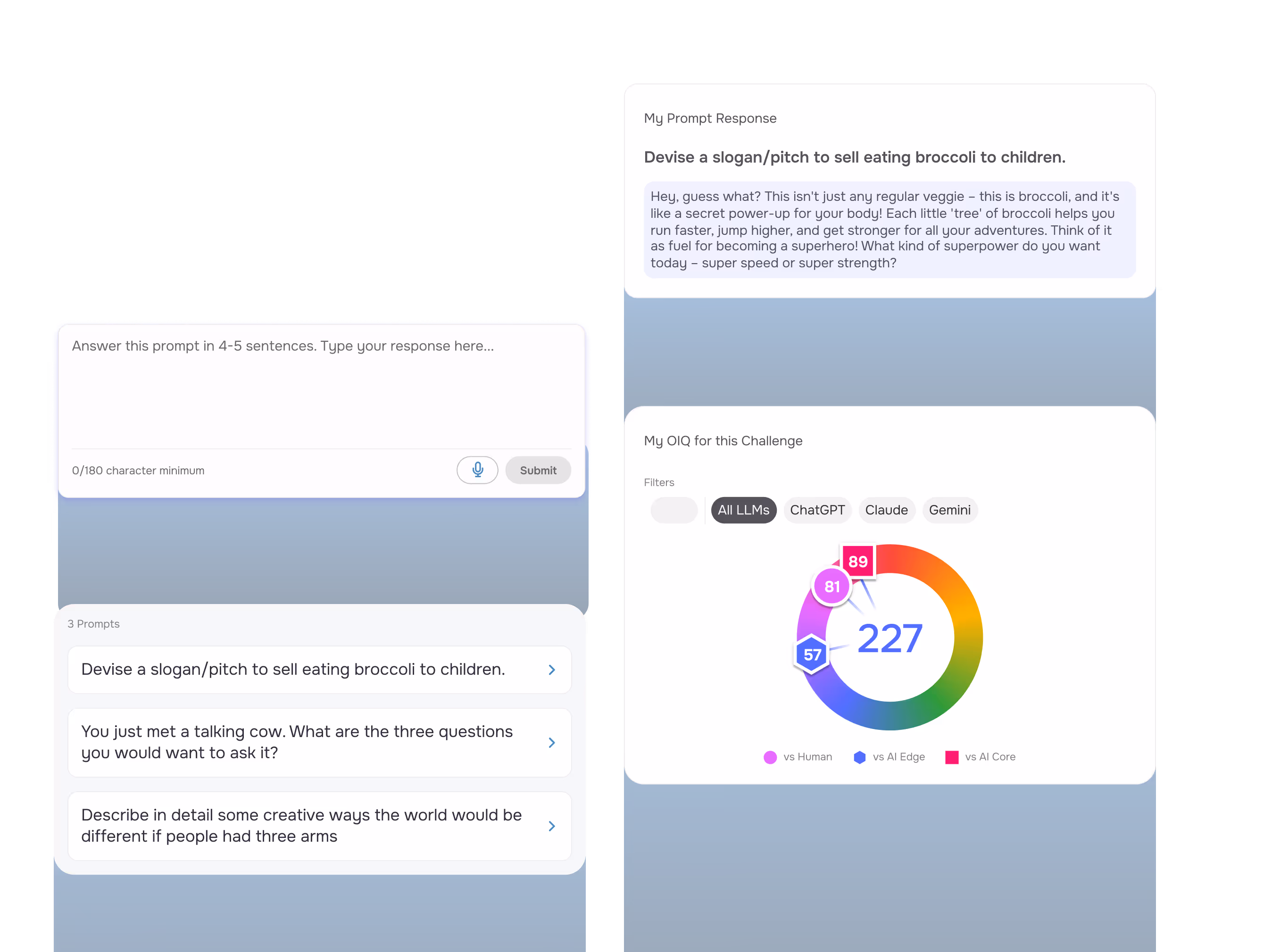Your Original Intelligence Quotient (OIQ) is the quantifiable measure of your particular approach to creating something new. It indicates your ability to generate original ideas, solutions, or perspectives that go beyond what AI or conventional thinking can produce.